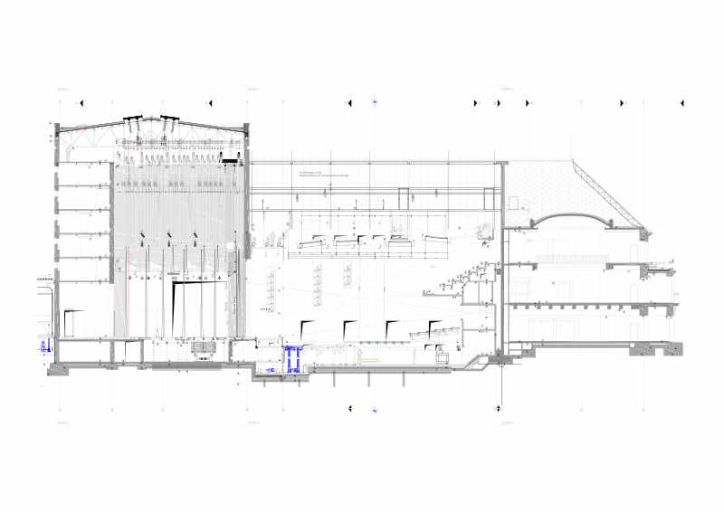 Die festen und beweglichen Stahlkonstruktionen umfassen eine Saalpodienanlage, feste Aufständerungen links, rechts und mittig, eine Saalbodenhubanlage als Stufenverstelleinrichtung, Transportpodien inkl. Übergangskonstruktionen sowie Saalausgleichspodien.